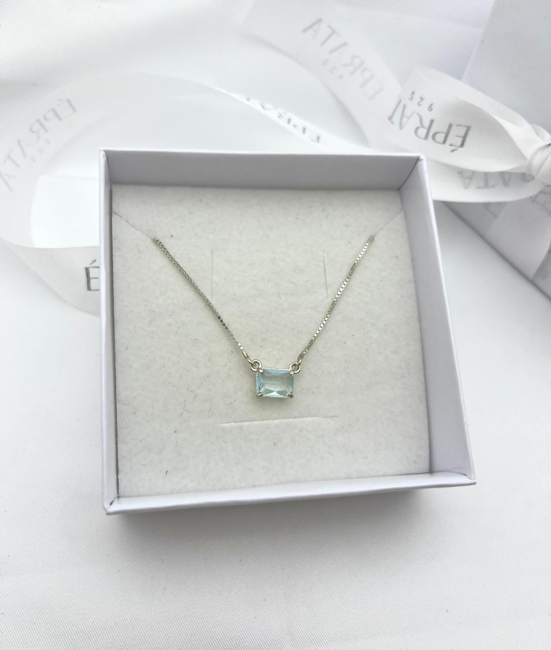 A gargantilha Prata 925 com pingente de caixa quadrada fixa e zircônia na cor acqua é a escolha ideal para quem busca elegância e delicadeza em uma só peça.